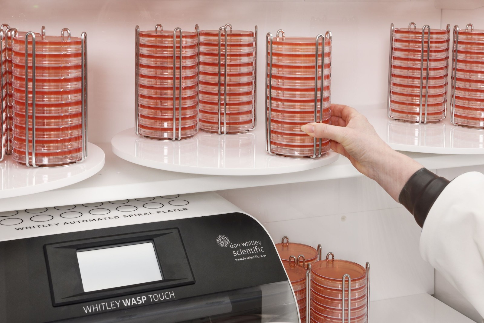 Dieser Drehtisch fasst bis zu 80 x 90 mm große Petrischalen und ist ideal für die Verwendung mit den größeren Whitley-Arbeitsstationen der Größen 135 und 155. Mit diesem Zubehör wird der Platz in der Kammer voll ausgenutzt. Es können bis zu drei Drehteller pro Regal montiert werden. Der Code für dieses Spezialregal lautet A08549.