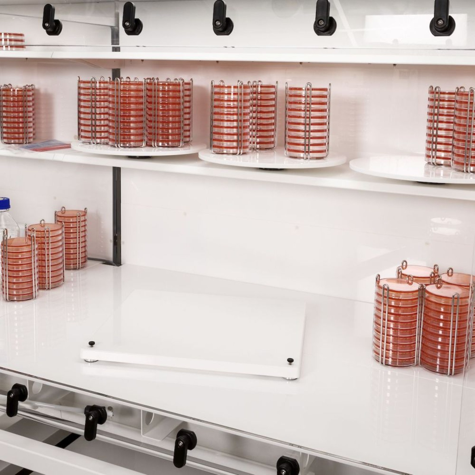 Eine robuste Plattform mit Rollen, die dazu dient, größere Geräte innerhalb einer Whitley Arbeitsstation zu bewegen.