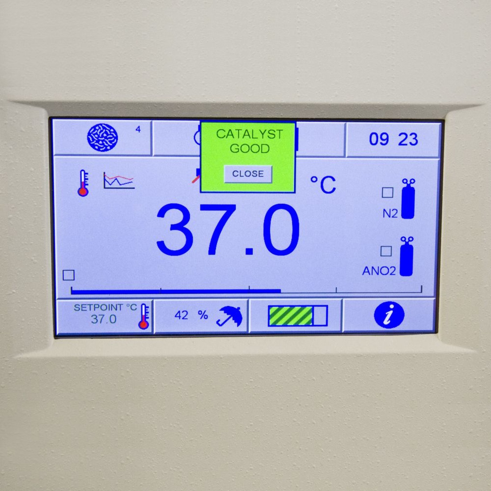 The Catalyst Monitoring System is a factory-fitted option for Whitley Anaerobic Workstations. It is set to conduct the test overnight so that when you arrive at the lab in the morning, a pop-up box on the touchscreen informs you of the status of the catalyst. ‘Green’ means all is fine and there is plenty of life left in the catalyst; ‘amber’ means the catalyst performance is reduced; and ‘red’ means that the catalyst should be changed to maintain good anaerobic conditions.