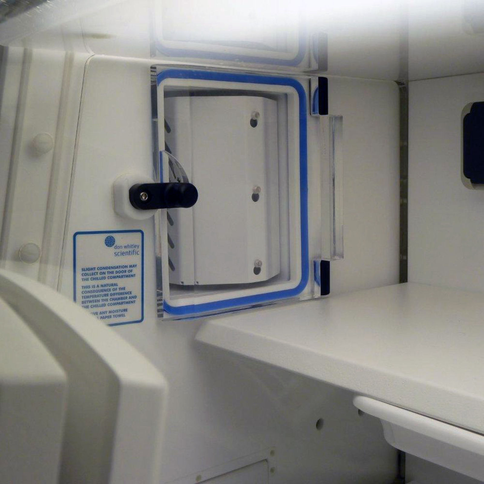 If you need to store small quantities of media and samples in anaerobic conditions, but at lower than ambient temperatures, you can now specify an optional Chilled Incubation Compartment for this workstation. This insulated compartment is located on the left hand side of the workstation and is accessed from the main chamber. When you open the compartment door, the plate carrier basket swings outwards to allow easy access. It has a capacity of 10 x 90mm Petri dishes or items of a similar size.