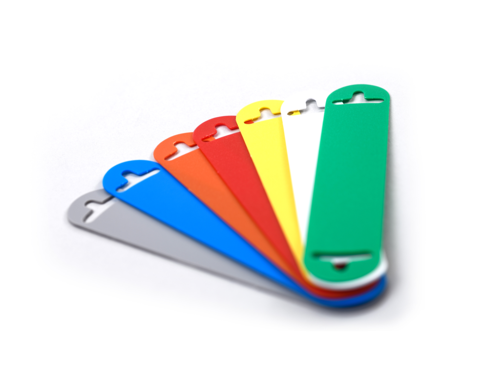 Each pack holds 10 tags of each of seven colours - one colour for each day of the week: yellow, blue, red, green, white, orange and grey.