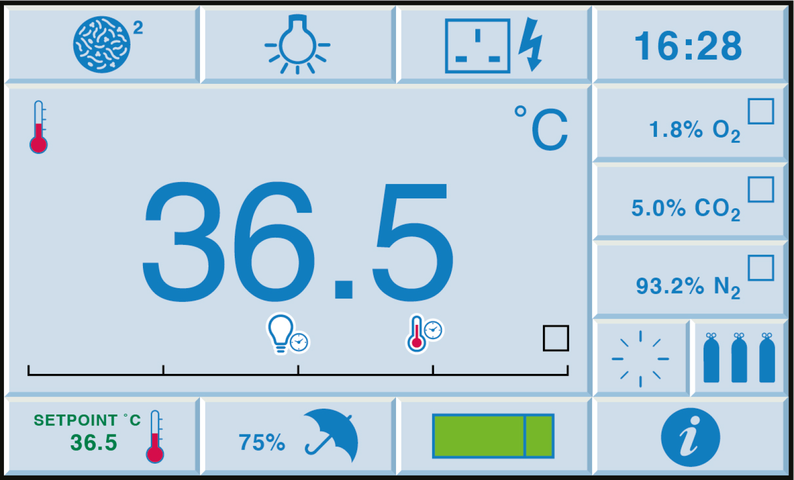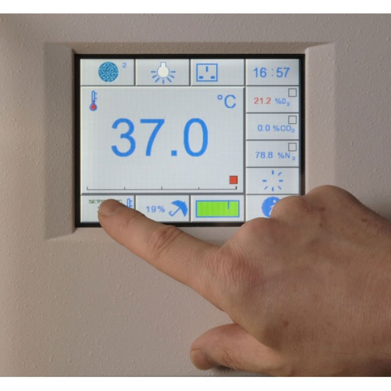 - Colour, touch-screen control panel for ease of use and for visual display of parameters such as oxygen level, carbon dioxide level, temperature, humidity, and airlock cycle status.